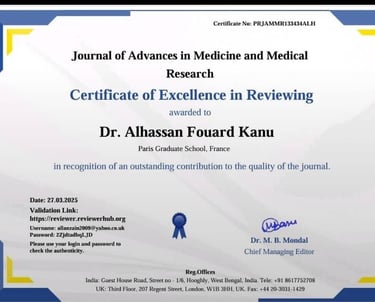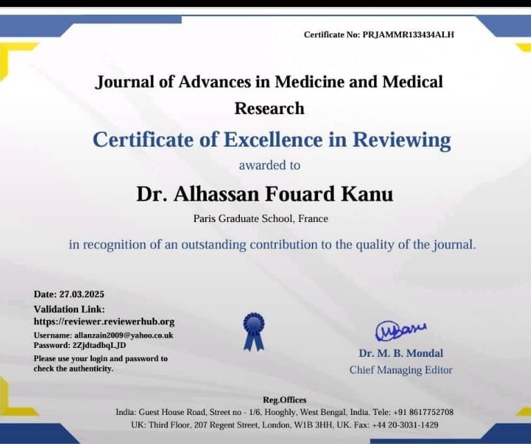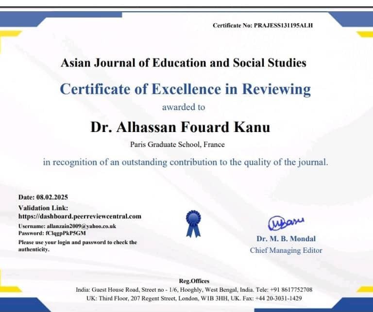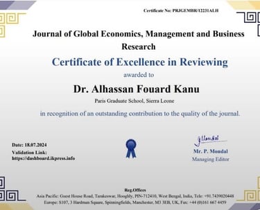 The Institute for Health Policy and Development (IHPD) proudly congratulates our CEO, Dr. Alhassan Fouard Kanu, for earning Certificates of Excellence in Reviewing from the Asian Journal of Education and Social Studies, Journal of Advances in Medicine and Medical Research, and Journal of Global Economics, Management, and Business Research. Awarded in February and March 2025, these accolades showcase Dr. Alhassan Fourad Kanu’s dedication to advancing global research and reflect IHPD’s commitment to excellence.